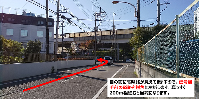 目の前に高架路が見えてきますので、信号機手前の道路を鋭角に左折します。真っすぐ200m程進むと当苑になります。